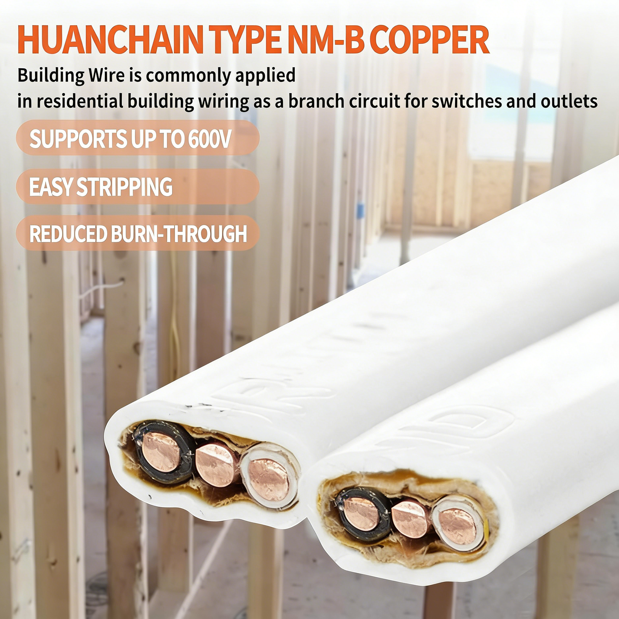 - متين وآمن أكثر: موصلان، بناءً على مقاس 14 صلب، ويحتوي الموصلات المعزولة (باللونين الأسود والأبيض) بشكل متوازٍ؛ يتم لف السلك الأرضي بورق مقاوم للحريق ويوضع بشكل متوازٍ بين الموصلات المعزولة؛ السلك الأرضي أيضًا بمقاس 14 صلب؛ الغلاف أبيض اللون لكابل NM-B بمقاس 14