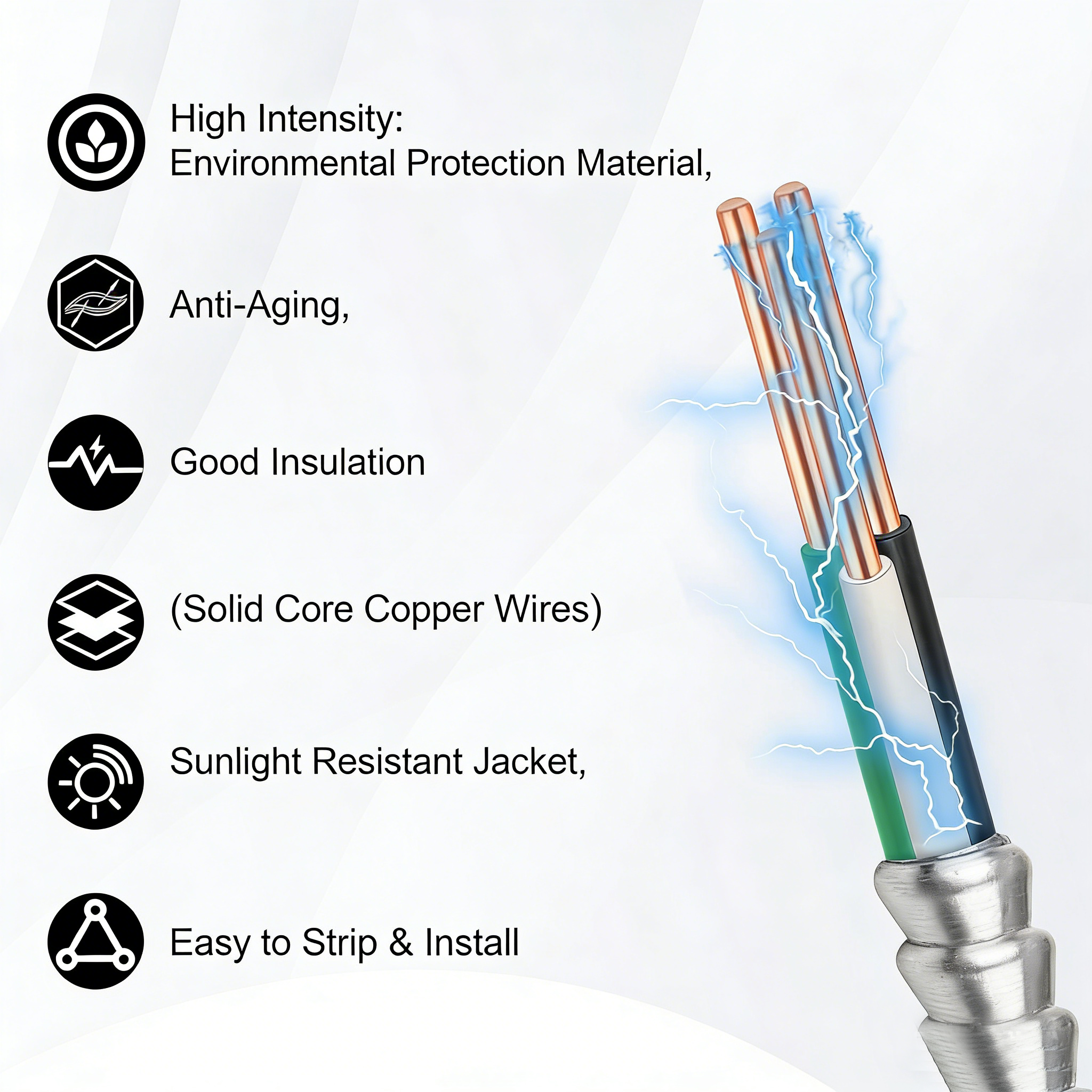 - Cabo 8 AWG (4 condutores: 2 de alimentação + 1 de terra), fabricado em cobre sólido nu; assegura compatibilidade com os casos de uso pretendidos (recomenda-se confirmar tamanho/estilo antes do pedido).